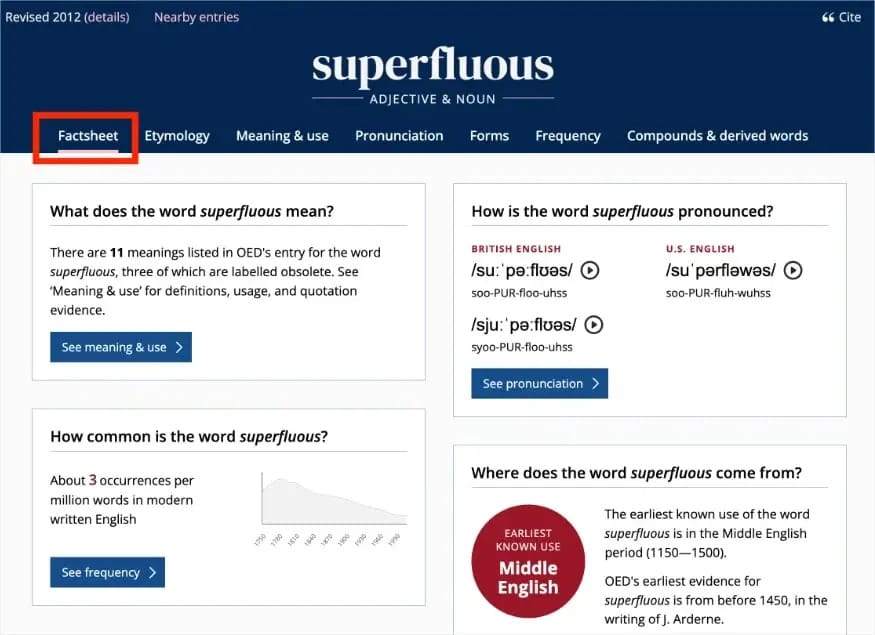 With this new model, users can access the most essential information via OEDâs âFactsheetâ tab on the website. A user only hits a paywall if they want to take it a step further and see content in other tabs regarding deeper analysis or historical context (i.e. entomology or compounds and derived words).