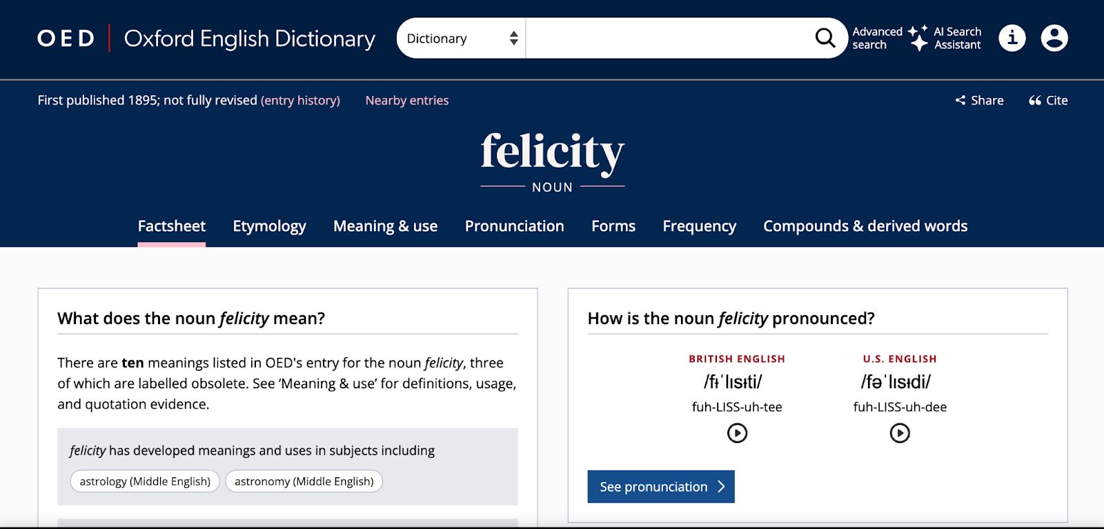 As part of the format of OEDâs Factsheet tab, the brand included headings with popular questions. So if you search âfelicityâ, youâll see headings like âWhere does the word felicity come from?â or âHow common is the word felicity?â