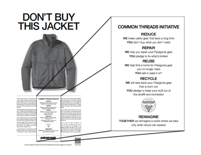 Running right down the middle of the ad is the Common Threads Initiative pledge. It lays out what the brand has pledged to do to limit its environmental impact and what it invites the consumer to do as part of the partnership. Â