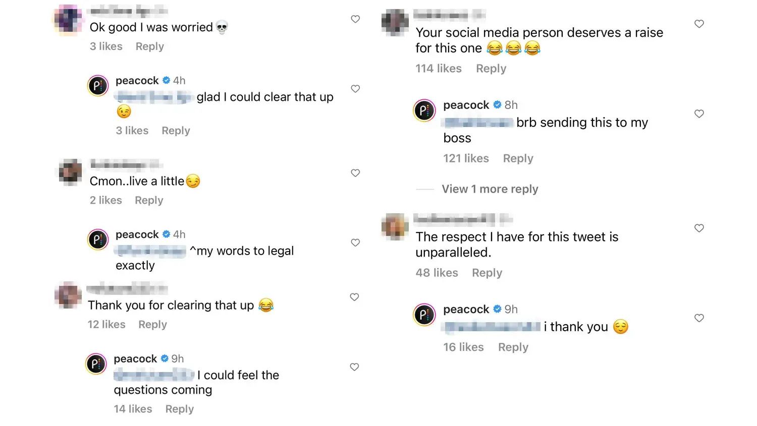 In tandem with those shifts, Peacock defined how their brand persona could be consistent, while still being flexible enough to make stylistic and tone shifts across different platforms. They began using social analytics and listening tools on a regular basis to monitor and identify opportunities to respond to moments on social media. And importantly, they established firm brand guardrails for assessing whether it makes sense to jump in from a business perspective.