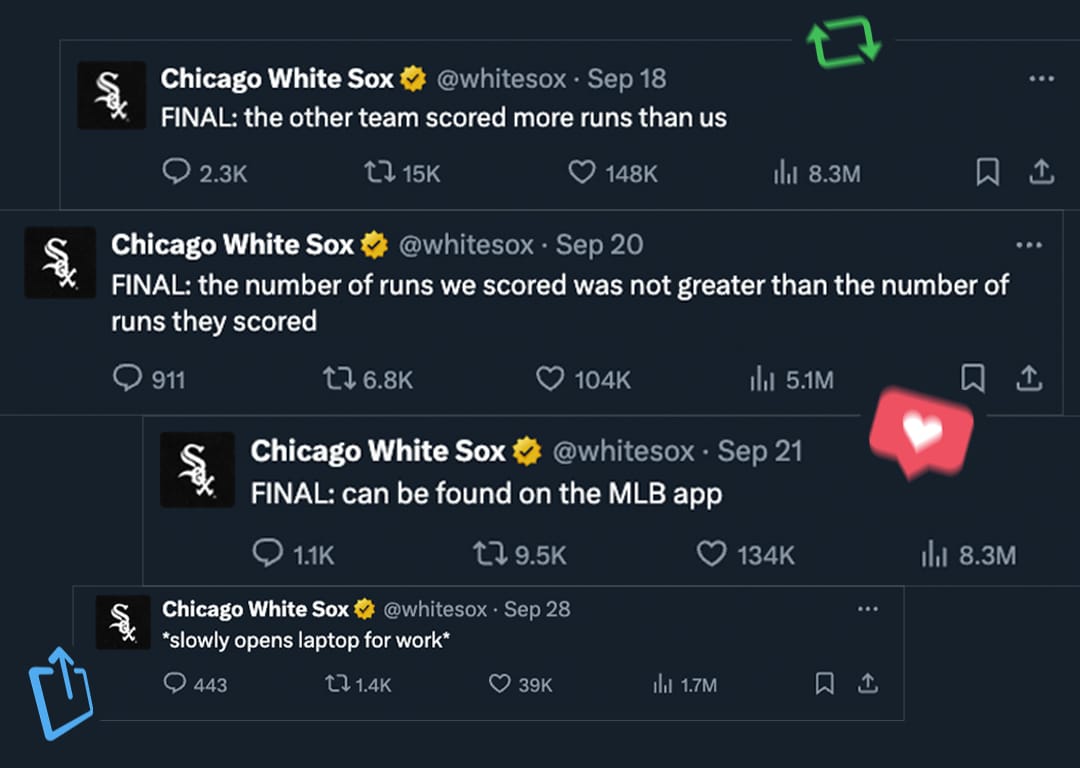 To do that, their in-house team used memes and text-only posts that didn’t follow the usual straightforward, templatized posts fans see from team accounts. Instead of posting the final score of games, the White Sox communicated scores in a different way (without actually revealing them). They said things like: