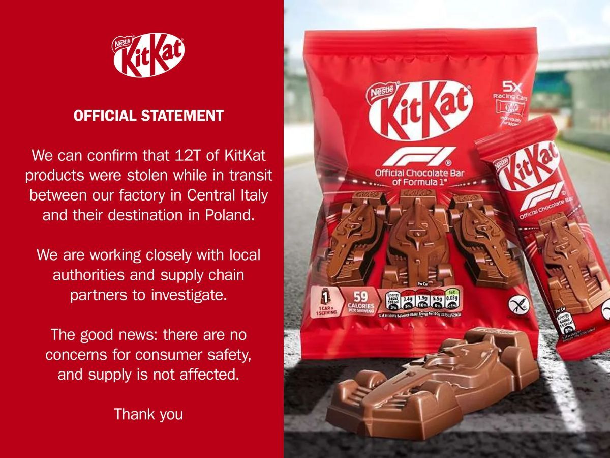 That brings us to March 26, 2026 when a truck carrying 413,793 of these mini F1 race car bars was intercepted somewhere between the factory and its destination in Poland. No one was hurt but 12 metric tons of chocolate was stolen and the vehicle was not recovered.